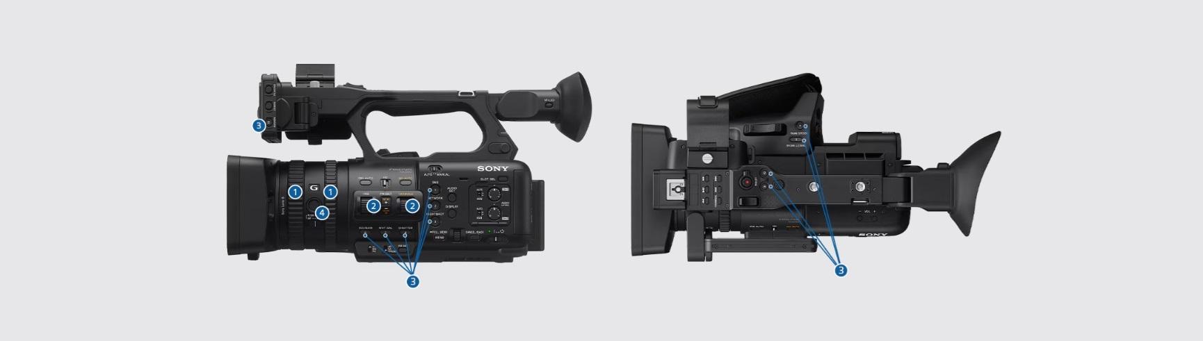 The NX800 is designed with the flexibility to operate according to your individual preferences and workflow demands. Two independent control rings for focus/zoom [1]* and two dials for IRIS/ND Variable [2] are located side-by-side, allowing for effortless control of exposure along with focus and zoom. The NX800 also has 12 user-assignable buttons (ASSIGN 1-11 [3] and FOCUS PUSH AUTO button [4]) that you can set to control almost any camera feature.
