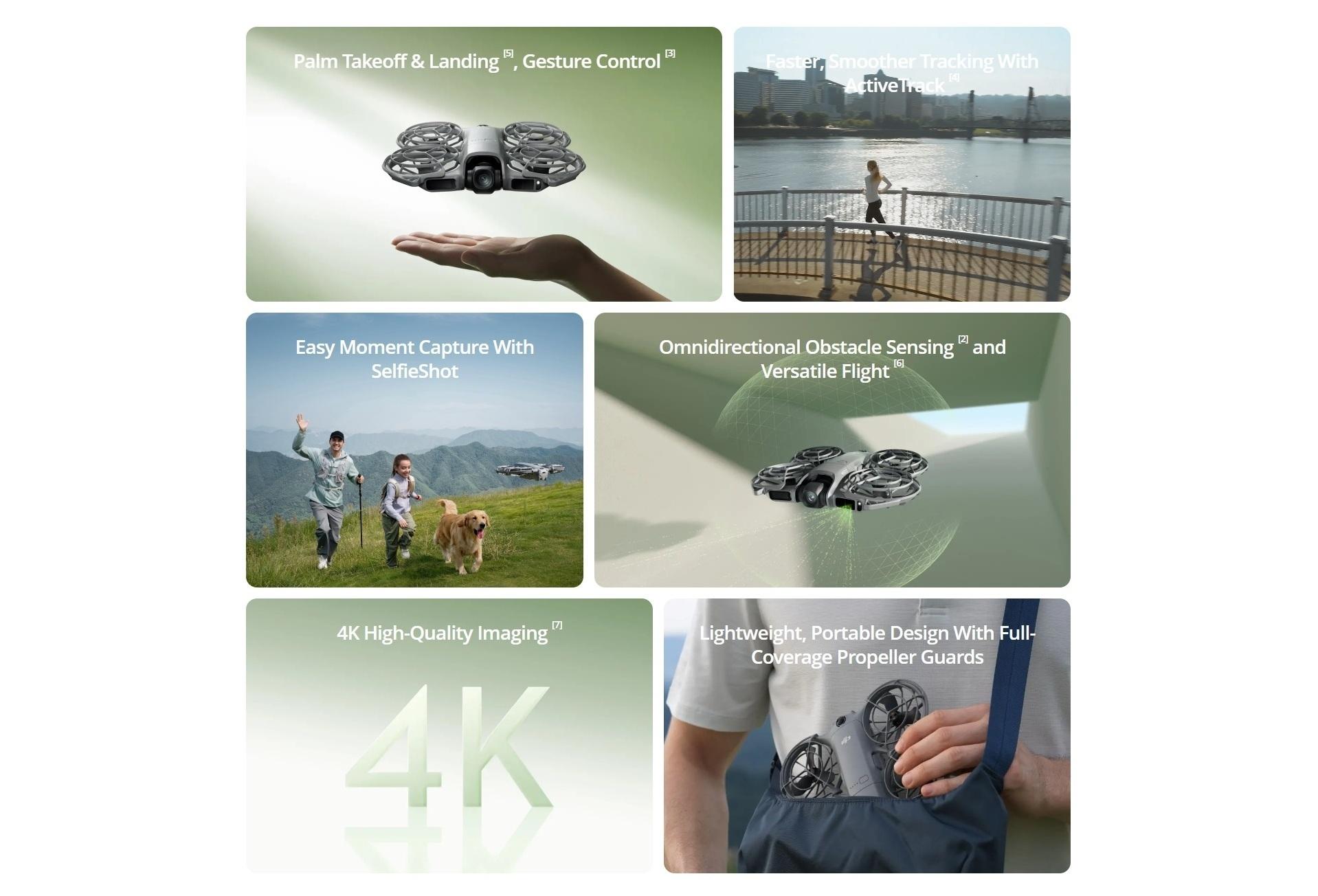 DJI Neo 2 supports ActiveTrack and SelfieShot, automatically framing subjects for smooth, hands-free shooting from start to finish. Multiple intelligent shooting modes unlock fresh perspectives and spark creativity in seconds. Combined with 4K video recording, Neo 2 delivers crisp, detailed, cinematic-quality footage.