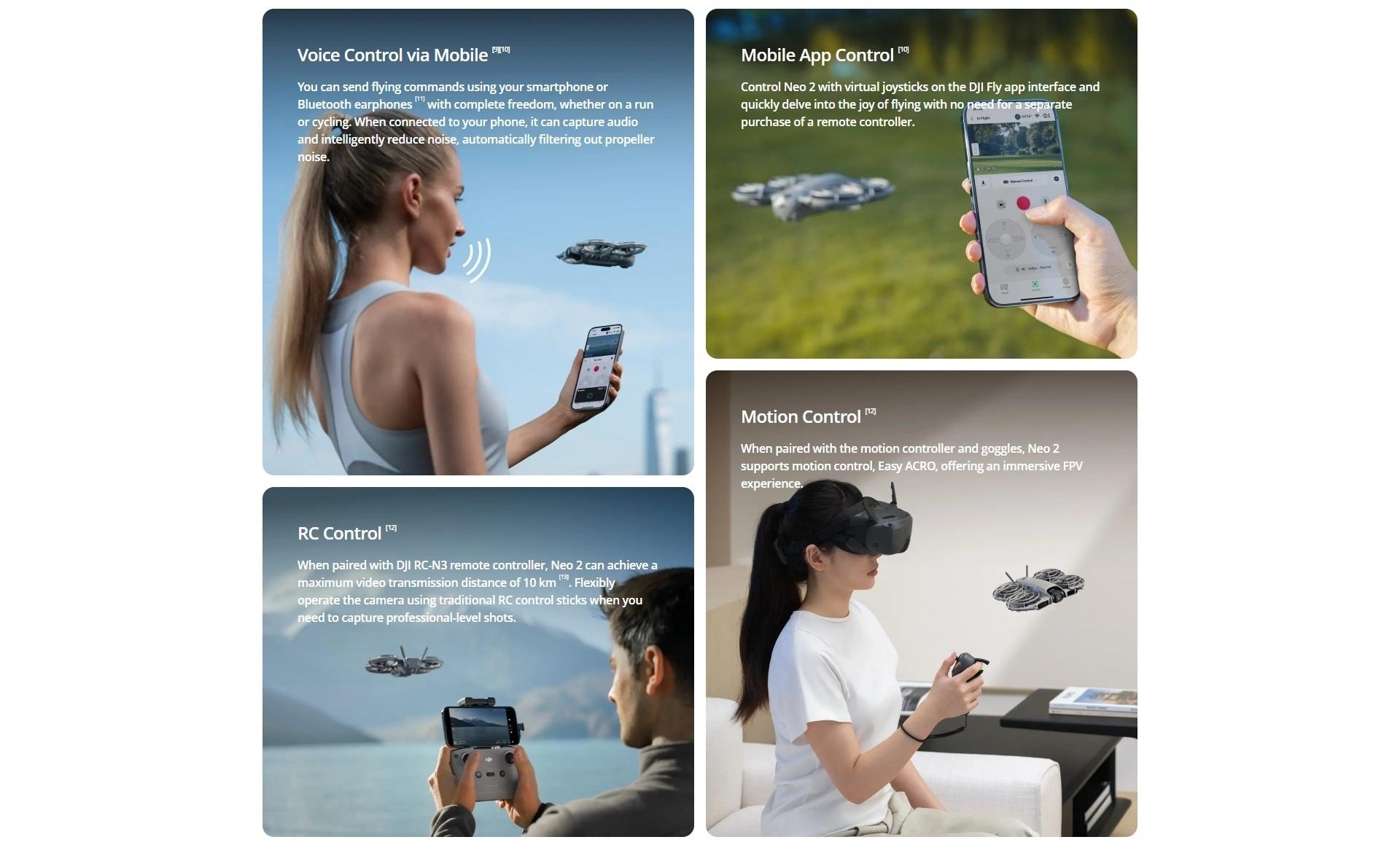 Neo 2 can follow you effortlessly even without a remote controller, ensuring every exciting moment is captured. Pair it with DJI RC 2 or DJI RC-N3 remote controller for easy-to-start aerial flights. Put on DJI goggles and use the motion controller for immersive FPV flights [8]. The fun never stops!