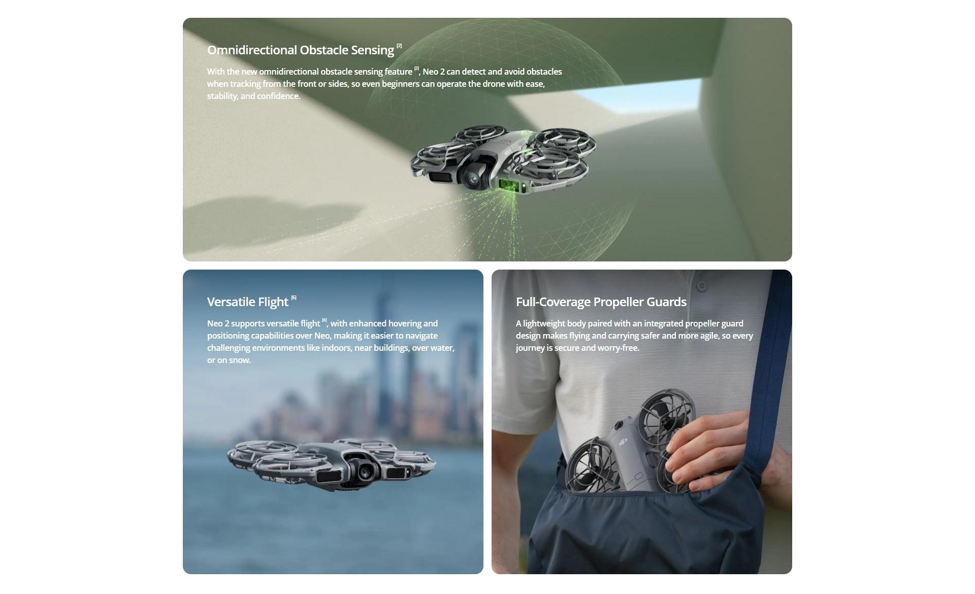 Don’t worry about returning home; when using palm takeoff or mobile app control, Neo 2 will return to the home point after completing its course. When using a remote controller or immersive motion control, Neo 2 supports Return to Home (RTH) and Failsafe RTH, activating obstacle avoidance during the return for enhanced safety and beginner-friendly operation.
