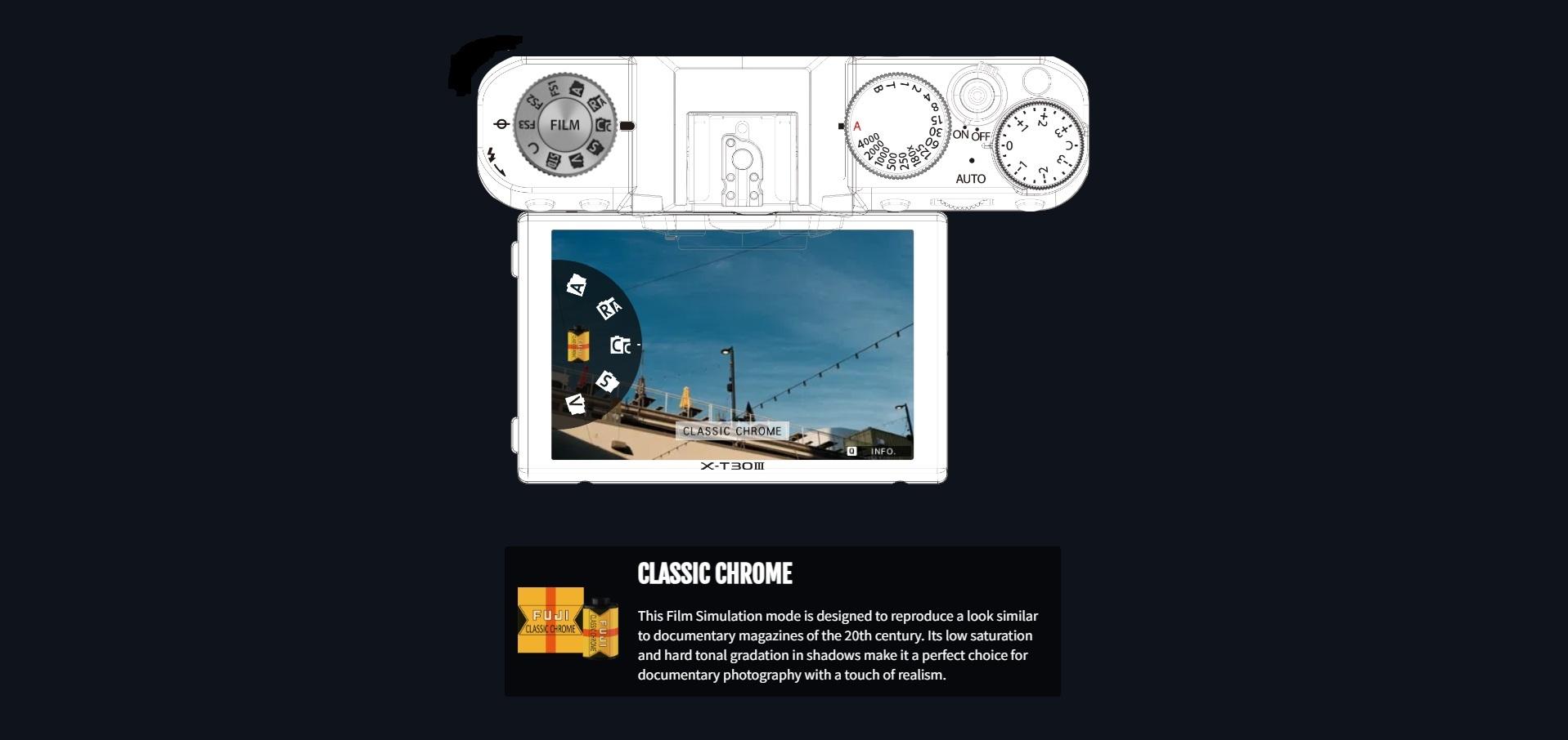 X-T30 III’s top-plate houses a customizable Film Simulation dial that lets you access your favorite options in quick time – or save and recall your own Film Simulation recipes on FS1 – FS3 dial.