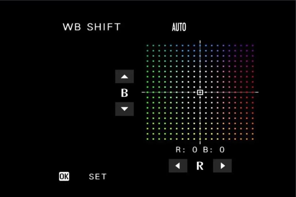 For white balance, choose Auto, Custom, Color Temperature, or a series of preset options. White balance can be fine-tuned in the WB Shift feature with red (R) and blue (B) color coordinates.