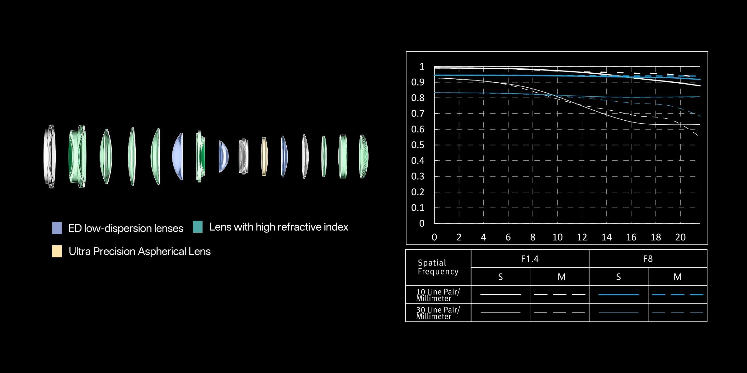 The precisely engineered optical design of 15 elements in 11 groups delivers edge-to-edge sharpness even at F1.4 maximum aperture, revealing phenomenal detail and clarity.