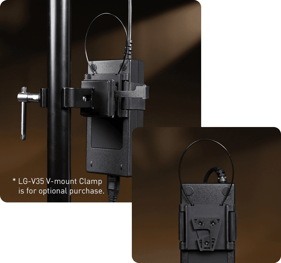 The power adapter is built with a safety strap and quick-release plate, for easy rigging and installation on light stands with the LG-V35 V-mount clamp.