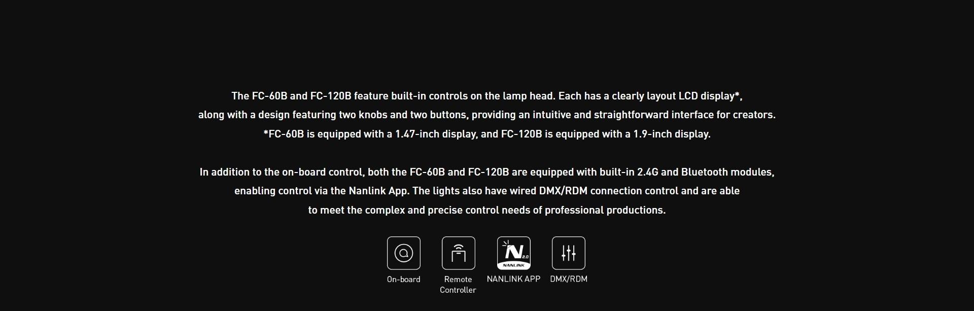 - On-board,Remote Controller,NANLINK APP,DMX/RDM