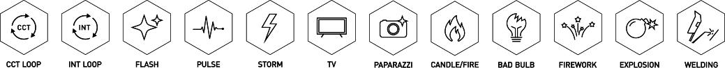 - CCT Loop、INT Loop、Flash、Pulse、Storm、TV、Paparazzi、Candle/Fire、Bad Bulb、 Firework、Explosion and Welding