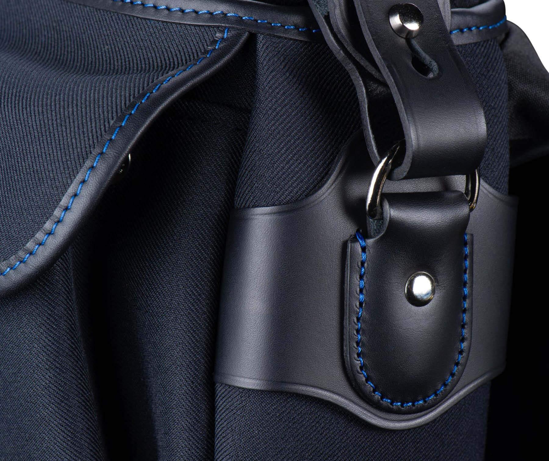 Top handle with leather on the underside for comfort when carrying without the shoulder