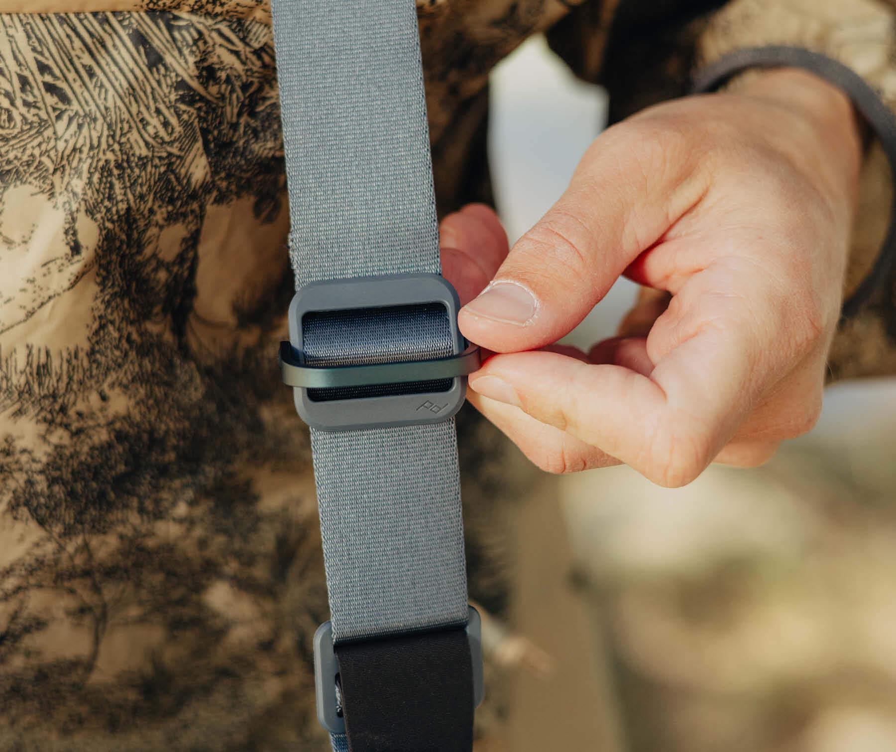 The Peak Design Everyday Sling is designed with adaptability in mind. It features an adjustable, padded shoulder strap for comfortable, hands-free carrying, which can be adjusted for both left and right shoulder use. Additionally, a stabilizing strap can be work around the chest or waist for added security and convenience.