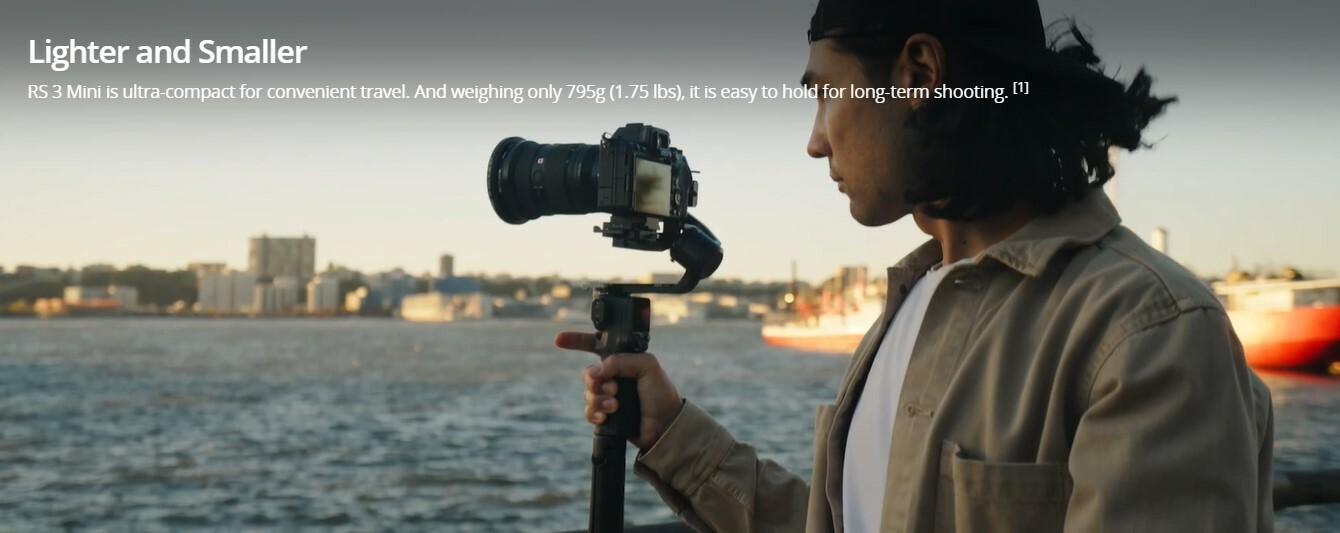 Gimbal: 795 g (1.75 lbs) in portrait mode and 850 g (1.8 lbs) in horizontal shooting mode (both including the Quick-Release Plate and excluding the Extended Grip/Tripod)