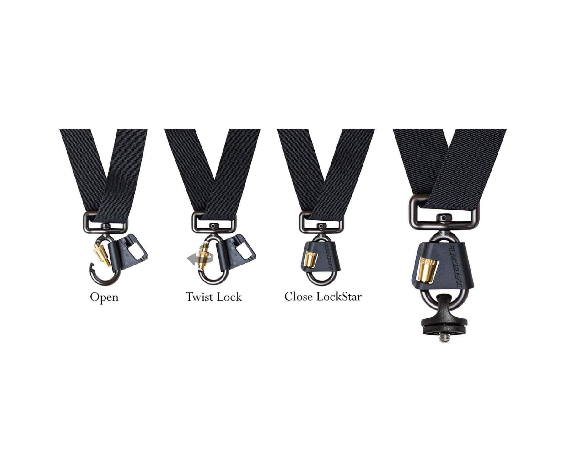 - Front and rear spring-loaded Cam-Locks on webbing help secure camera by the hip
