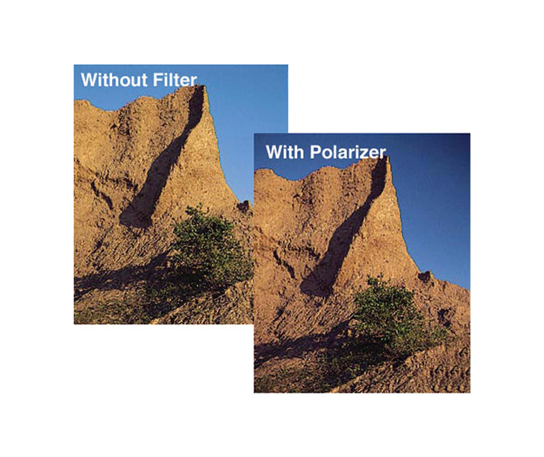 Tiffen Circular Polarizer Filters: Light rays that are reflected become polarised. Polarizing filters are used to control what light rays enter your camera lens. They can reduce undesirable reflections from non-metallic surfaces such as water or glass, and saturate colours to improve contrast. The effect can be seen in the viewfinder and adjusted by rotating the filter. The filter factor varies depending on how the filter is spun and oriented to the sun.