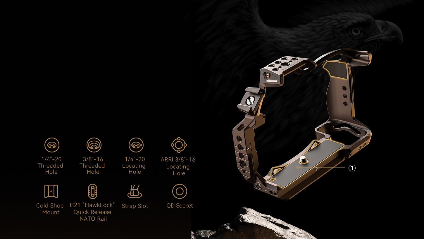 - Includes 1/4"-20 threaded holes, 1/4"-20 locating holes, 3/8"-16 threaded holes, ARRI 3/8"-16 locating holes, HawkLock quick release NATO rail, QD socket, and cold shoe mounts