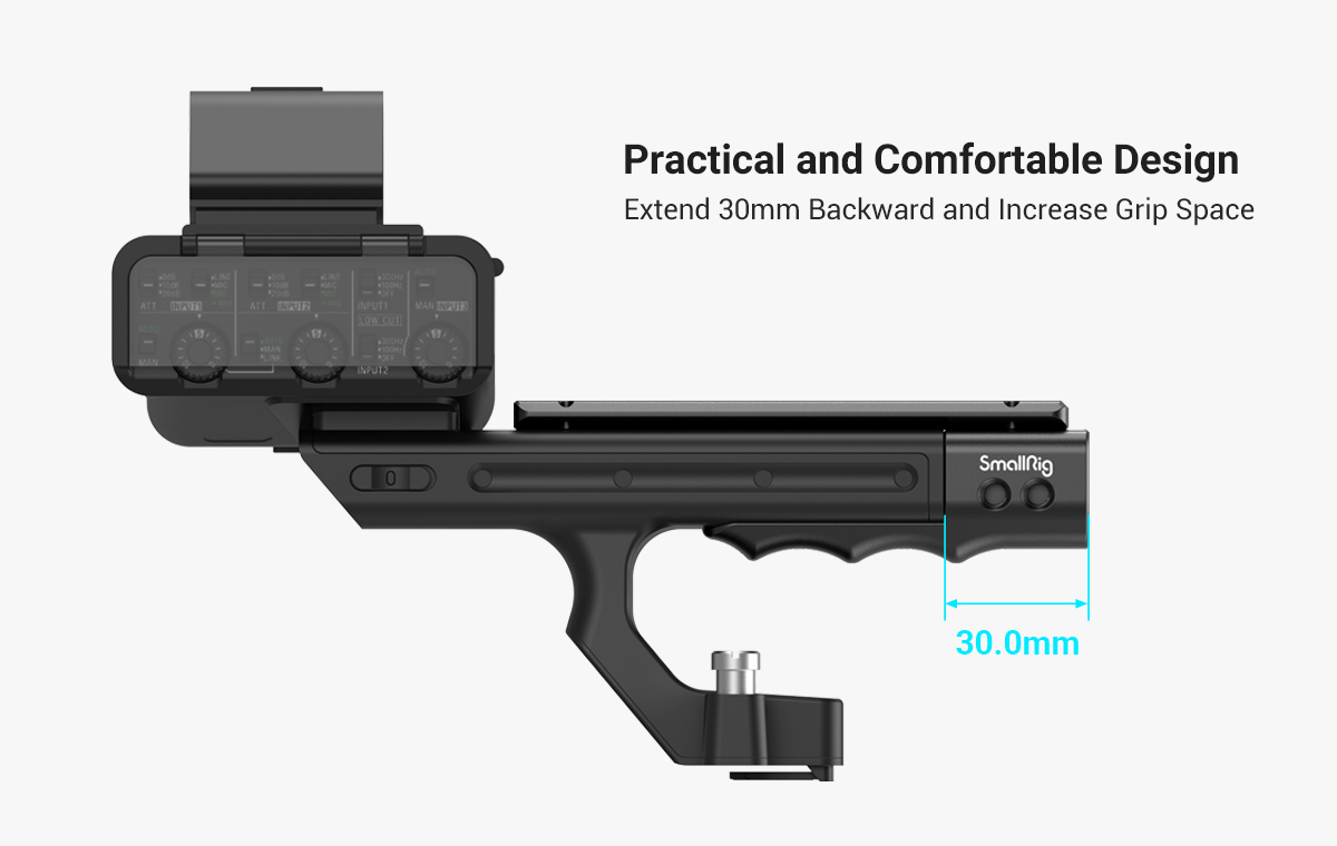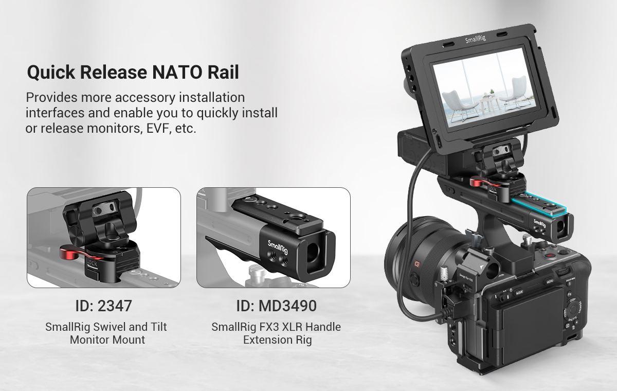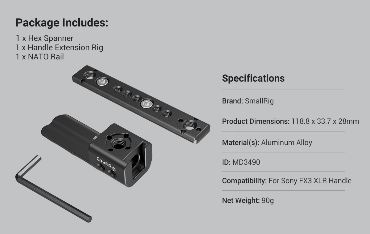 SmallRig Sony FX3 / FX30 XLR Handle Extension Rig MD3490 is designed to extend the length of the FX30 / FX3 XLR Handle and add more accessory mounting interfaces. The extension rig is installed at the end of the FX30 / FX3 XLR Handle by a 1/4"-20 screw, which can extend the FX30 / FX3 XLR Handle back by 30mm. It is ergonomically designed to provide users with a comfortable grip. In addition, the extension rig is also equipped with a NATO rail, which is installed on the top of the FX30 / FX3 XLR Handle by two 1/4"-20 screws. It provides more accessory installation interfaces for shooting scenes so that you can quickly install/release monitors, EVF, etc. The extension rig has Cold Shoe, multiple 1/4"-20, 3/8"-16, and ARRI 3/8"-16 accessory threads, providing multiple accessory mounting interfaces for shooting. In addition, the NATO rail can be removed and the extension rig can be used separately.