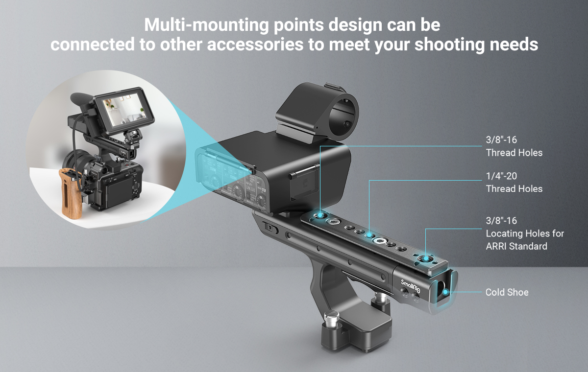 - Multiple 1/4"-20 & 3/8"-16 & ARRI 3/8"-16 Accessory Threads