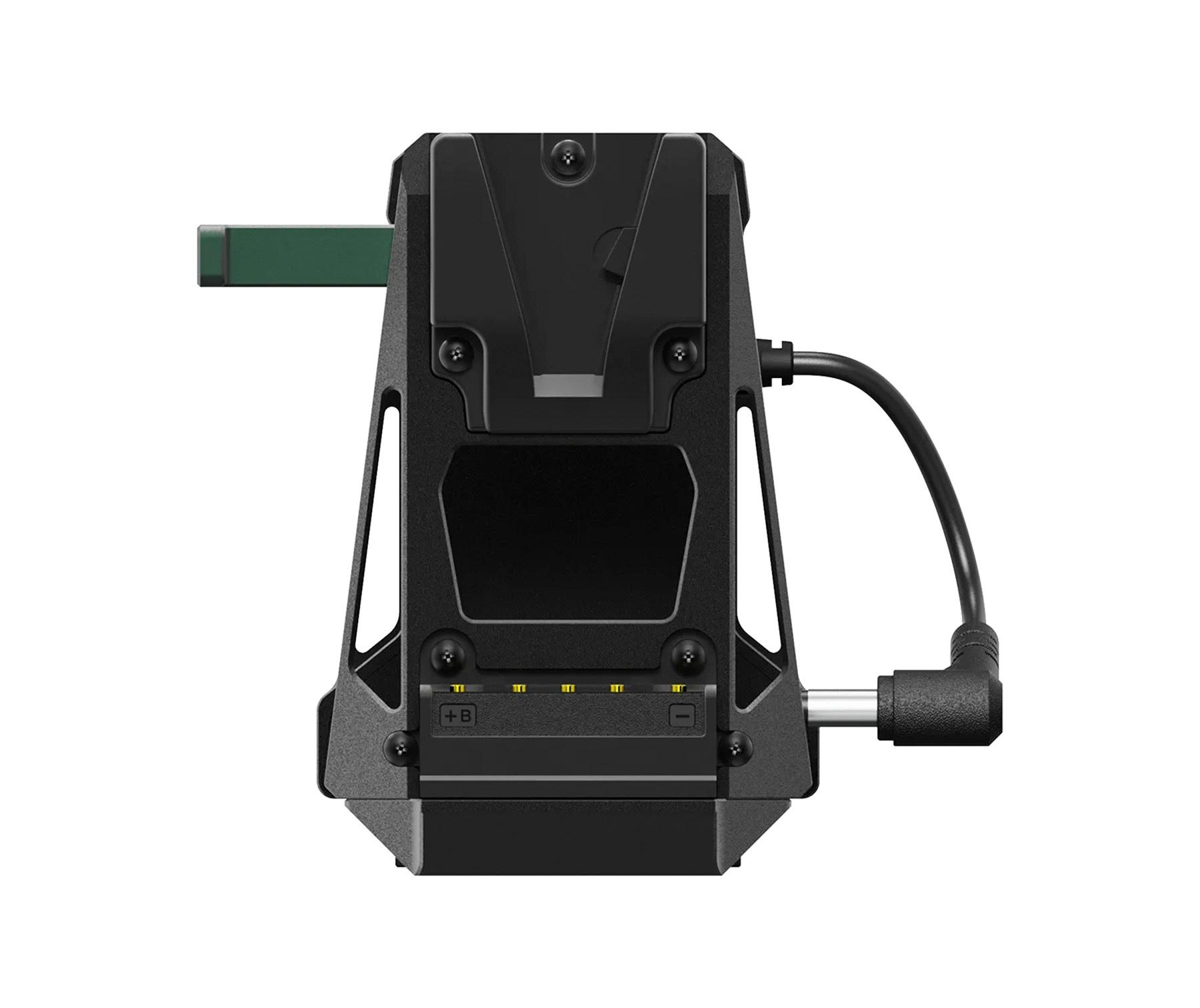 The CineView Master 4K or CineView 2 SDI wireless transmitter is securely held in the adapter and powered via a short captive DC cable. Power from the V-lock battery is passed through to the camera.